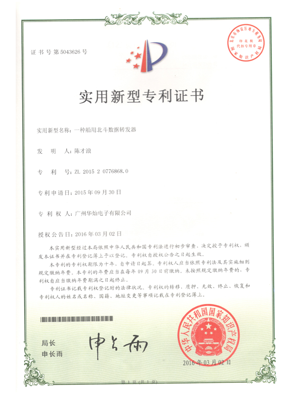 Certificate No. 5043626 Marine Beidou Data Transponder
